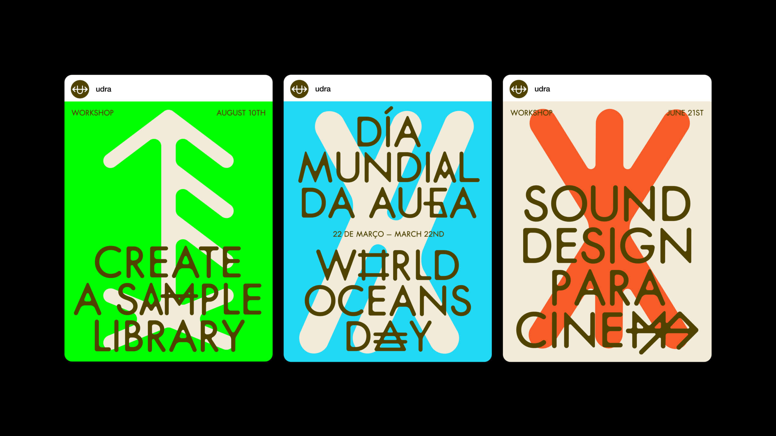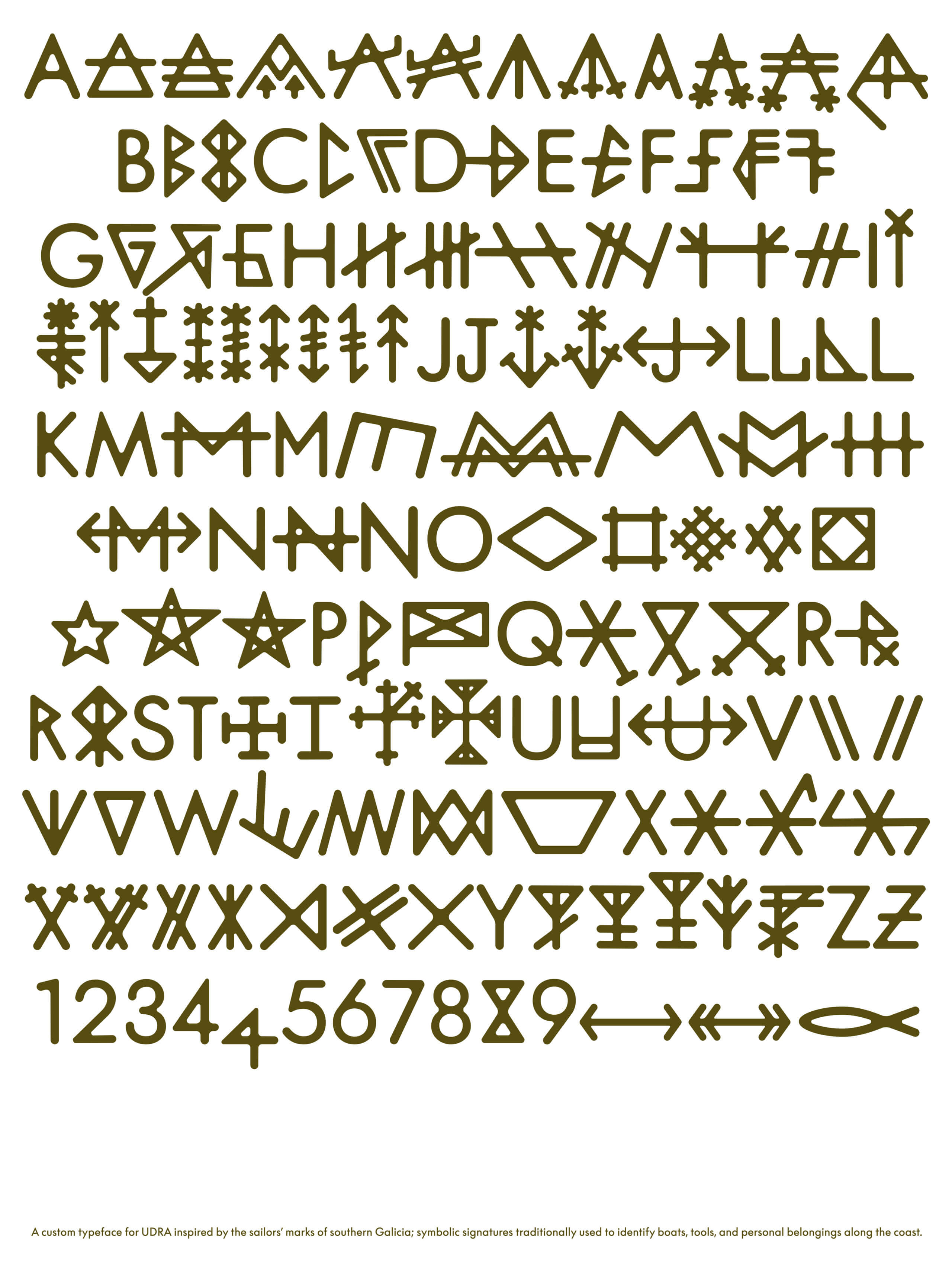 Since UDRA stands on a cape facing the sea, its identity is built around a typeface inspired by the marks used by sailors from A Guarda. A custom typeface was developed, reinterpreting these traditional symbols as alternative glyphs within a cohesive typographic system.